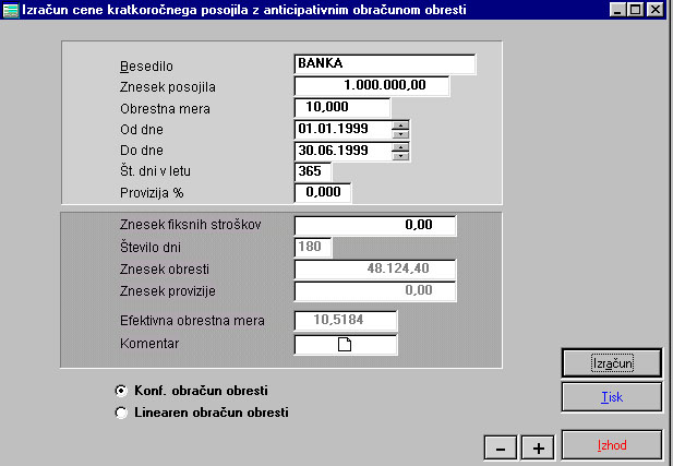 POSTOPEK: Anticipativno obrestovanje je pri ostalih enakih pogojih dražje od dekurzivnega zato, ker obresti plačamo vnaprej. Pri enaki obrestni meri torej plačamo enak znesek obresti, vendar na začetku obrestovalnega obdobja. Povedano drugače, ker so obresti plačane na začetku obrestovalnega obdobja, razpolagamo ceteris paribus z manjšim zneskom posojila kot v primeru dekurzivnega obrestovanja. Vzemimo najbolj enostaven primer, ko najamemo posojilo v znesku 1000 d.e. za dobo enega leta po 10 % obrestni meri. Pri anticipativnem obrestovanju bomo obresti plačali na začetku obrestovalnega obdobja, kar pomeni, da bomo prejeli 1000 d.e., takoj plačali obresti v znesku 100 d.e. in razpolagali z 900 d.e. Na koncu obdobja bomo vrnili glavnico v znesku 1000 d.e.