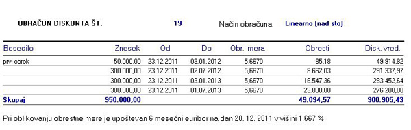 Ker znani obroki vsebujejo tudi obresti, je potrebno prve štiri zneske diskontirati . To storimo v oknu Diskont I (Glavni menu->Diskont->Diskont I) . Zneske diskontiramo od dneva načrtovane zapadlosti do dne 23. 12. 2011. Uporabimo metodo „linearno nad 100“, ki upošteva, da so v zneskih plačil vključene obresti.