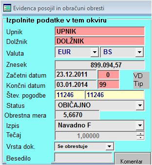 S tem smo dobili diskontirano (sedanjo vrednost) prvih štirih plačil. Če jih odštejemo od celote (1.800.000-900.905,43) dobimo sedanjo vrednost 5. obroka v znesku 899.094,57. Ta znesek je potrebno naobrestovati od 23. 12. 2011 do 03. 01. 2014. To storimo v oknu Evidenca posojil (Glavni menu->Obresti->Evidenca posojil v EUR)