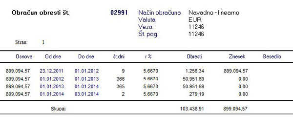 obrestna mera 5.667 % letno, obračun obresti pa je linearen s 365/366 dnevi v imenovalcu.