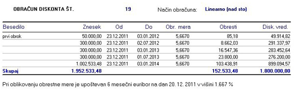 Za kontrolo lahko v oknu Diskont I dodamo navedeni znesek k obračunu, tako da preverimo, da je znesek diskontirane vrednosti vseh petih plačil na dan 23. 12. 2011 točno 1.800.000.