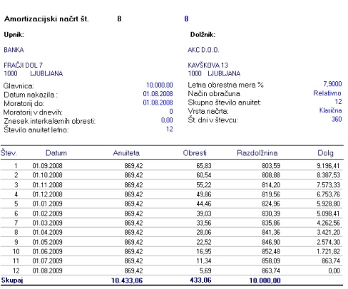 klikom na gumb "Izdelava am. načrta" nam program izdela amortizacijski načrt iz katerega so razvidni obroki,