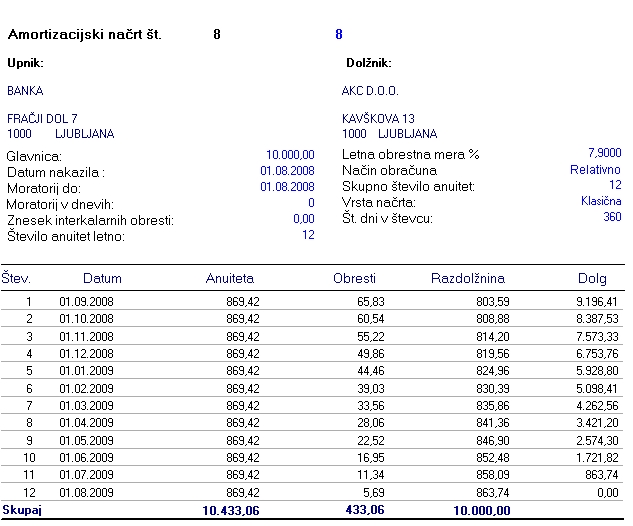 posojila je 01.08.2008. Odplačilo je mesečno v 12 zaporednih obrokih. Obresti obračunavamo relativno, enake anuitete, upoštevamo 360 dni v imenovlcu in dejansko število dni v števcu.