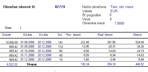 POSTOPEK: Amortizacijski načrt, na osnovi katerega smo odplačevali posojilo, je načelno nepomemben, ker ne vsebuje temeljne obrestne mere ali pa vsebuje predvideno temeljno obrestne mero, ki ni enaka dejanski. Drugače povedano, z amortizacijskim načrtom smo določili višino anuitete (obroka), ne moremo pa ga uporabiti za ugotavljanje stanja posojila. Stanje posojila lahko ugotovimo le tako, da posojilo in vsa vračila naobrestujemo za čas od datuma poslovnega dogodka (nakazila ali vračila) do datuma končnega stanja. Za to operacijo bomo uporabili okno EVIDENCA POSOJILA (GLAVNI MENU >> OBRESTI), ter vnesli podatke o posojilu in podatke o vseh plačilih, ki se nanašajo na to posojilo. Pri tem nima nikakršnega smisla plačila deliti na obresti in razdolžnine v skladu z amortizacijskim načrtom.