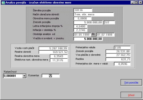 V oknu EVIDENCA POSOJILA posojilo vpišemo. Pomembno je, da v polju IZPIS izberemo Temeljno obrestno mero (oziroma način obrestovanja, ki velja za posojilo). Nato pritisnemu gumb K- ANALIZA POSOJILA. Program obračuna obresti in odpre okno ANALIZA POSOJILA, v katerem so podatki že prenešeni.