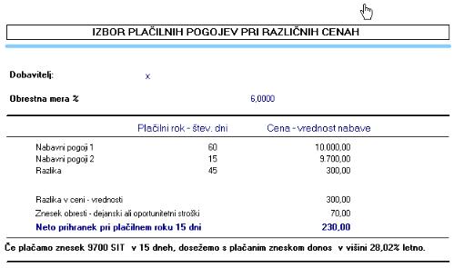 POSTOPEK: Vnesete plačilo 10.000 (oziroma poljuben znesek...) za 60 dnevni plačilni rok in 9.700 (oziroma poljuben znesek zmanjšan za višino cassa sconta, v našem primeru za 3%) za 15 dnevni rok ter ustrezno obrestno mero (po kateri lahko dobite kredit ali plasirate prosta sredstva).