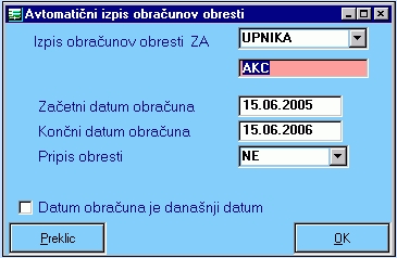Odpre se nam okno AVTOMATIČNI IZPIS OBRAČUNOV OBRESTI, kjer določimo izpis obračunov obresti za upnika ali dolžnika, obračunsko obdobje, pripis obresti in po potrebi odkljukamo Datum obračuna obresti je današnji datum.