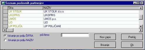 Šifro upnika ali dolžnika lahko vpišemo ročno ali z dvoklikom na rdeče obarvano polje. Odpre se iskalnik partnerjev. Partnerja lahko iščemo po nazivu ali po šifri. Ko ga najdemo, ga s klikom označimo in pritisnemo gumb OK.