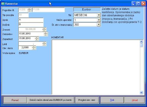 Upoštevati je potrebno tudi, ali se upošteva v imenovalcu koledarsko število dni (365 oziroma 366) ali idealno (360 dni), kar je prav tako določeno v pogodbi. V našem primeru bomo obračunali obresti na način, ki je opredeljen v točki a in s 360 dnevi v imenovalcu.V polje »Način uporabe« izberemo način obračunavanja obresti – 1, 2, 3, 4 (poleg vsakega načina obračunavanja je podrobna obrazložitev). V našemu primeru je to 1.