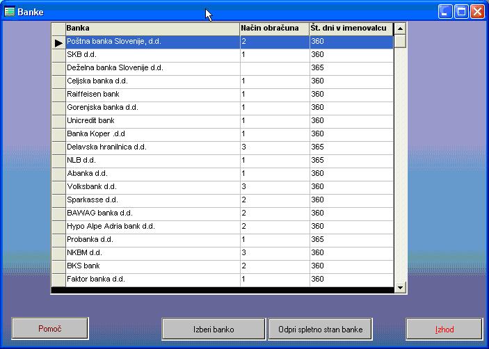 Druga možnost je, da način uporabe izberemo glede na banko upnico. To storimo s klikom na spodnji gumb »Določi način obračuna EURIBOR po banki« in izberemo ustrezno banko: