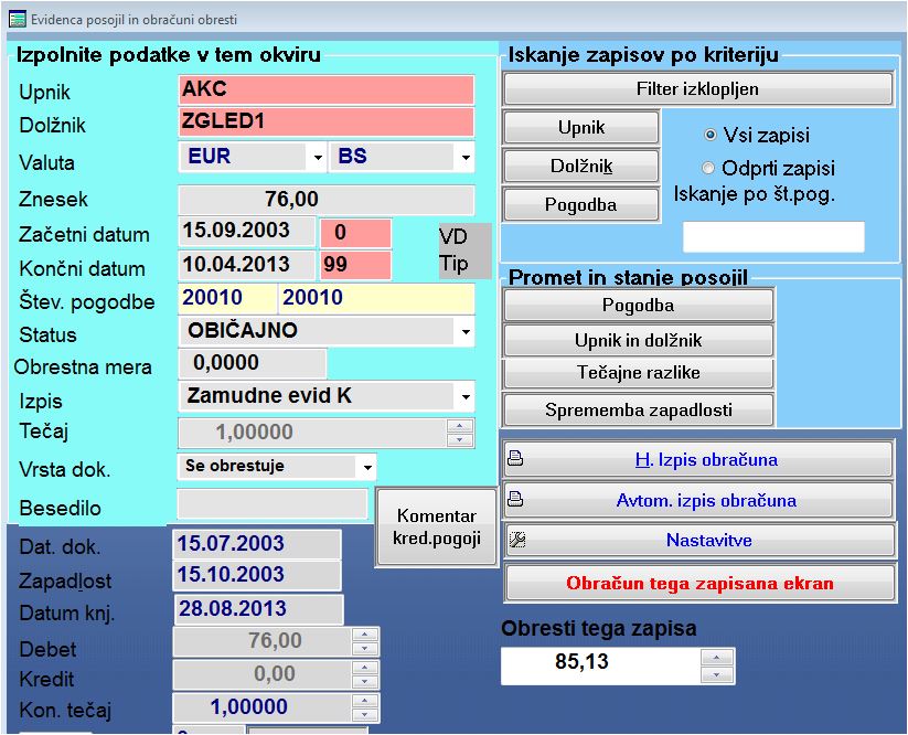 Ker gre za dolgo obdobje in obstoja verjetnost, da obresti presegajo glavnico, bomo najprej vnesli zadnji znesek, ki se obrestuje od 15.09.2003 dalje. Zapis bomo vnesli z novo številko pogodbe, vrsta izpisa pa je "Zamudne evid K". Nato bomo pritisnili gumb "Obračun tega zapisa na ekran" in ugotovili, da znesek obresti 85,13 EUR presega znesek glavnice.