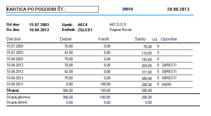 Torej je celotni dolg, ki ga moramo odtegniti dolžniku, enak 2 kratnemu znesku (glavnica + obresti) in podatek lahko vnesemo v enem znesku ali analitično (kot v našem primeru). Pri tem si pomagamo z bližnjico (CTRL+S - vnos z delnimi zapisi). Ko vnesemo celotni dolg, vnesemo še plačilo (z negativnim zneskom) in v prihodnosti ostala plačila. V sliki 2 je prikazana kartica po vnosu prvega plačila.