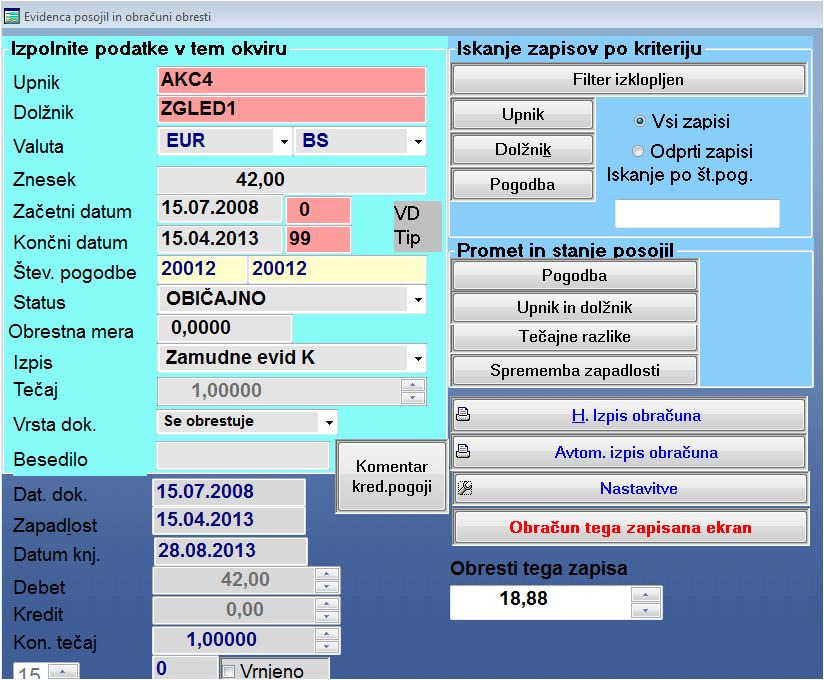 V tem primeru ne gre za tako zelo dolgo obdobje, zato lahko začnemo kar s prvim zneskom. Zapis bomo vnesli z novo številko pogodbe, vrsta izpisa pa je "Zamudne evid K". Nato bomo pritisnili gumb "Obračun tega zapisa na ekran" in ugotovili, da znesek obresti 18,88 EUR ne presega znesek glavnice.