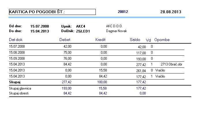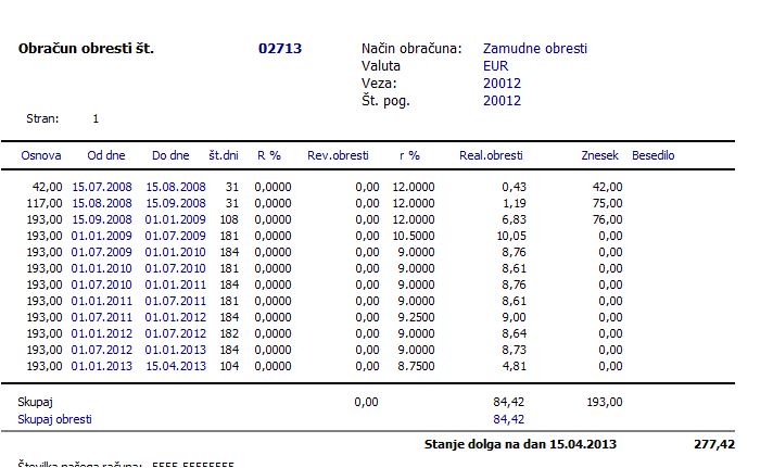 Preden bomo vnesli prvo plačilo, bomo obračunali obresti od 15.07.2008 do dneva plačila 15.04.2013 in jih pripisali v evidenco (nastavitev v oknu za izpis obresti).