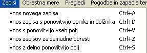 PODROČJE: POMOČ PRI UPORABIKako vnašamo podatkeProgram Cena Kapitala vam omogoča enstaven vnos podatkov. Nudi vam vrsto možnosti, da lahko podatke vnesete hitro in učinkovito.Vnos iz menuja oziroma z bližnicamiCTRL+A in CTRL+N omogočata vnos za novo kreditno pogodbo ali nov obračun zamudnih obresti CTRL+U omogoča vnos novega zapisa za novo pogodbo, kje sta upnik in dolžnik ista kot v zapisu, CRTL+S v novem zapisu ponovi večino podatkov iz prejšnjega zapisa. Če torej pritisnemo najprej CTRL +A in vnesemo podatke o novem kreditu, potem pa želimo vnesti še podatke o delnem vračilu, pritisnemo CTRL+S in pogram bo sam v novem zapisu vpisal šifro upnika, dolžnika, številko pogodbe, način obračuna itd. ; ročno je potrebno vnesti še znesek in začetni datum ter eventuelno besedilo CTRL+V je namenjen vnosu enakih zneskov. Npr. vpisujemo podatke o štipendiji, ki jo je nekdo prejemal 24 mesecev v enakih zneskih. Prvič pritisnemo CTRL+A in vnesemo nov zapis, ki bo imel novo številko pogodbe, nato pa pritiskamo CTRL+V in kurzor se bo postavil v začetni datum. Tako praktično pritiskamo CTRL+V in vpisujemo datume. Vse ostale elemente vpiše program CTRL+Z je namenjen vnosu podatkov za zamudne obresti, kjer so različni začetni in končni datumi, program pa samodejno vnaša podatke o upniku, dolžniku in številku pogodbe. Vnos z gumbom Nov zapis![]() Delo z bližnjicami je hitrejše kot delo z gumbom Nov zapis, vendar omogoča tudi pomote. Če se nahajate na zapisu nekega posojila, ki ima v polju VD vrednost 1 (torej so to pripisane obresti) in pritisnete CTRL+S, bo program tudi za nov zapis v polje VD vpisal vrednost 1. Ta utegne biti napačna, če želite vpisati delno ali popolno vračilo posojila. Gumb Nov zapis ima kontrolne točke, ki jih morate označiti (gre za polji "VD" in "Vrsta dokumenta", ki določa, ali se zapis obrestuje.) Pripis obresti ob izpisu obračuna