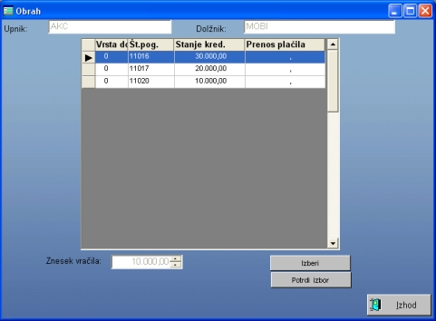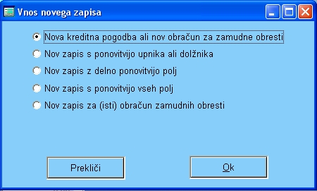 sami (odpre se novo okno, kjer določite to vrednost).![]() Gumb evidenca vračilaS tem gumbom vnesete podatek o plačilu obresti. Npr. dolžniku obračunate obresti in jih avtomatično pripišete v bazo podatkov. Ko želite evidentirati plačilo obresti, poiščete ta zapis (pripisane obresti)in pritisnete gumb Evidenca vračila in program vpiše vse potrebne podatke.Gumb vračilo celotnega posojilaS tem gumbom vnesete podatke o vračilu celotnega posojila. Poiščete št. pogodbe, kliknete na gumb Vrač.cel.pos. in program izračunal, koliko znaša znesek neplačano glavnice, obresti in stroškov in vnesel plačilo po teh kategorijah.Hitro delo samo s tipkovnicoČe imate množico podatkov, ki se nanašajo ne določeno posojilno pogodbo ali obračun zamudnih obresti, lahko v oknu "Nastavitve", ki ga odprete z gumbom "Nastavitve", nastavite hitri režim dela. Najprej z bližnjico CTRL+A vnesete nov zapis in vnesete podatke za prvi zapis. Nato pritisnete gumb Nastavitve in v polju Ponovitev podatkov pri novih zapisih izberete vrednost "S". Zaprete okno Nastavitve, pritisnete CTRL+S in vnesete nov podatek. Ko zapustite polje Začetni datum (s pritiskom na tipko ENTER), se odpre okno z vprašenjem "Vnos novega zapisa?". S pritiskom na tipko ENTER se vnese nov zapis in kurzor se že postavi na znesek. Delo je izjemno hitro, saj vnašate samo zneske in datume in s potrditvijo datuma se zabeleži nov zapis. Pri nastavitvi"V" se kurzor postavi na datum, tako da vpisujete samo datume. Ta nastavitev je primerna, če so zneski, ki jih vnašate, enaki, razlikujejo pa se datumi poslovnega dogodka (npr. štipedijo, odplačilo enakih anuitet pri posojilu itd.)Evidenca vračila posojila s funkcijsko tipko F6Ta funkcija omogoča, da pri evidentiranju plačila (vračila posojila ali plačila obresti) ne iščete številke pogodbe, kar sicer program omogoča, temveč enostavno vnesete podatke o upniku, dolžniku, znesku plačila in datumu plačila (pritisnete torej CTRL+A in vpišete zgoraj navedne podatke. Na polju "Končni datum" pritisnete tipko F6 in program bo odprl okno z vsemi odprtimi pogodbami vpisanega upnika in dolžnika.![]() Med pogodbami izberete tisto, na katero se nanaša plačilo in pritisnete gumb "Zapiranje posojil". ![]() Če je znesek večji od posojila, ki ste ga zapirali, se okno ponovno odpre in izberete naslednjo pogodbo. Nazaj na glavni menu |