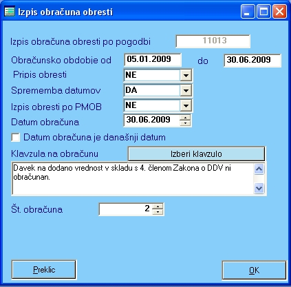 Ko pritisnete gumb za izpis obračuna obresti, se odpre okno za izpis, v katerem je opcija "PRIPIS OBRESTI". Če izbere možnost DA, se